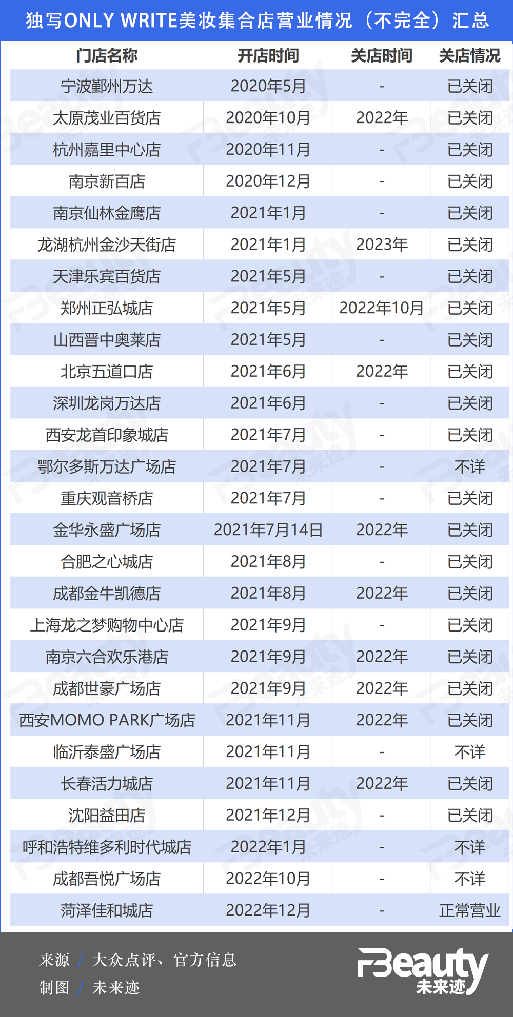 《FBeauty未來跡》盤點HAYDON黑洞現(xiàn)存門店,發(fā)現(xiàn)目前僅剩兩家仍在營業(yè)。此外,被這股“寒潮”波及的還不止這一家,ONLY WRITE獨寫27家門店也幾近全部停止營業(yè)。