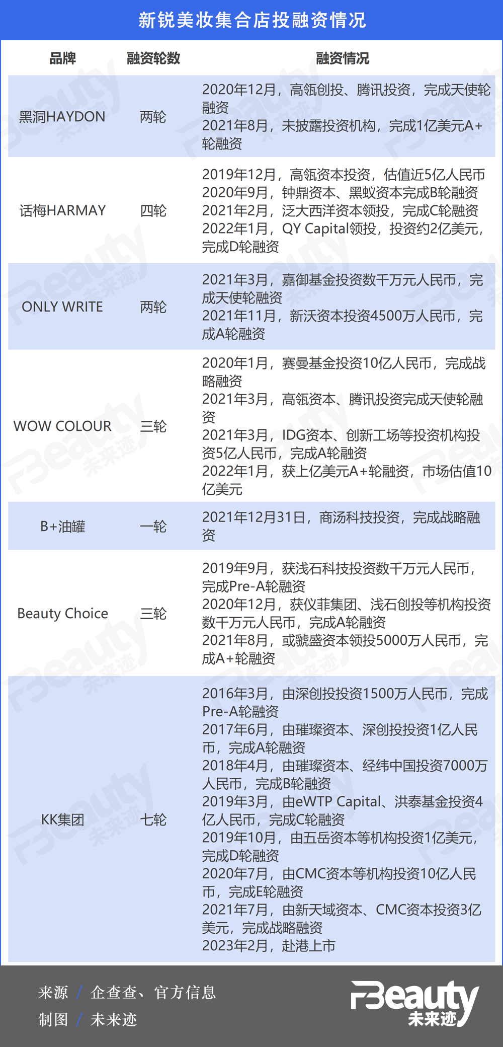 值得關(guān)注的是,2021年左右也是新型美妝集合店廣受投資人青睞的一年,話梅HARMAY、ONLY WRITE、WOW COLOUR、Beauty Choice等新型集合店均在2021年左右獲得融資,旗下?lián)碛蠯KV、調(diào)色師的KK集團在2021年7月之前更是陸續(xù)獲投7次。