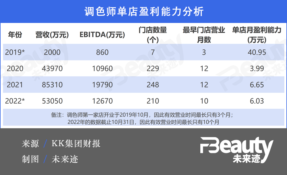 以入局時間較長的KK集團旗下THE COLORIST調(diào)色師為例,根據(jù)此前集團公布的財務(wù)數(shù)據(jù),其近兩年的單店月盈利能力穩(wěn)定在6萬元左右,祛除門店開業(yè)時間點等因素,已經(jīng)和屈臣氏不相上下。