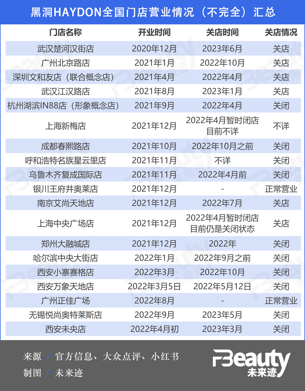 時間來到2022年,HAYDON黑洞的營業(yè)狀況急轉(zhuǎn)直下,從4月份開始接連關(guān)店!禙Beauty未來跡》梳理發(fā)現(xiàn),整個2022年,HAYDON黑洞至少關(guān)閉了8家2021年開設(shè)的門店。其中上海中央廣場店、新梅店開張均不超過四個月,便宣布因疫情原因閉店。