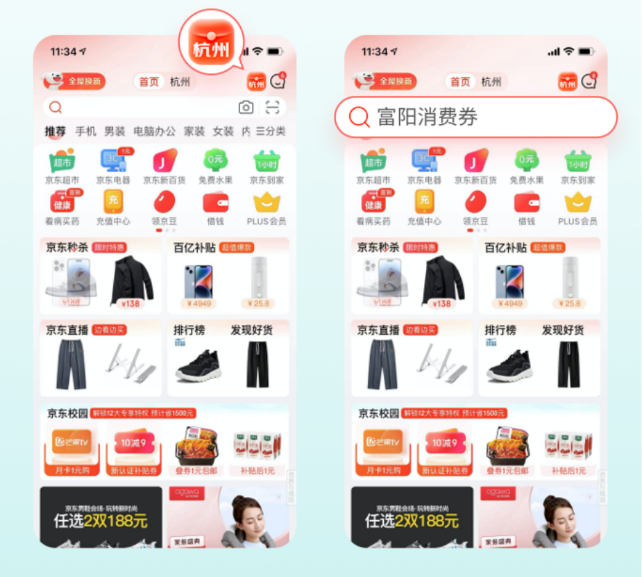 本次活動面向的是地理位置定位在杭州市的全體用戶,打開京東APP,在首頁搜索“富陽消費券”或點擊首頁頂部右上角圖標,進入專區(qū)即可領(lǐng)券。