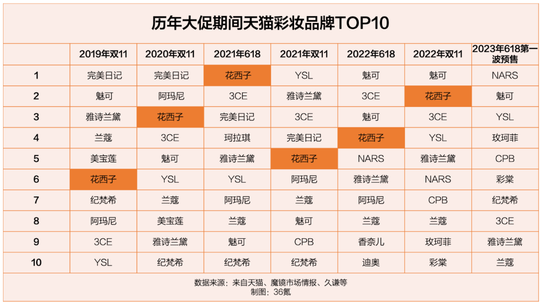 完美日記的營收一路下滑,2022 年收入同比下滑了36.5%,2023年Q1營收同比下滑14.09%;從去年618開始,完美日記已經徹底缺席天貓618美妝類Top10,而花西子也在今年618,滑落到Top10之外。