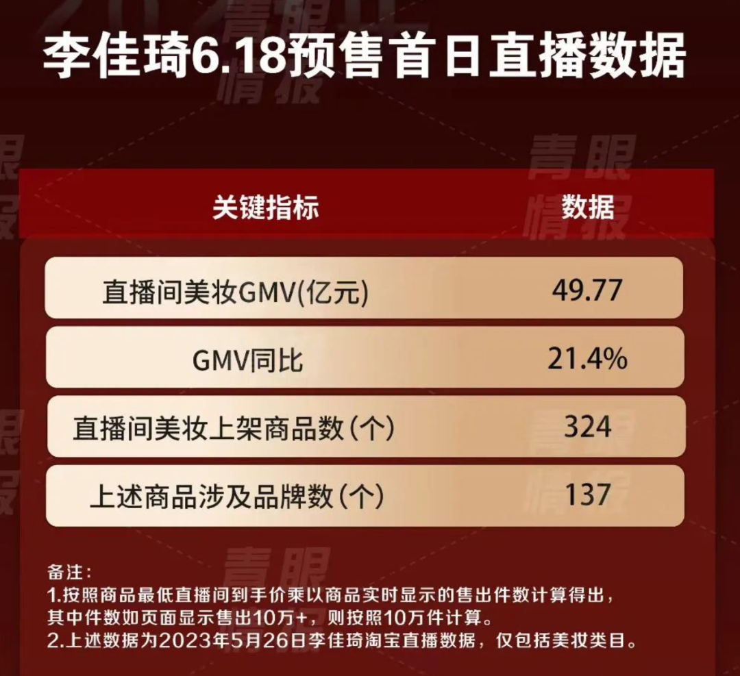《青眼》發(fā)布的天貓618戰(zhàn)報顯示, 截至5月27日凌晨1:30,李佳琦直播間預售首日美妝GMV達到49.77億元(按照商品最低直播間到手價乘以商品實時顯示的售出件數(shù)計算得出,其中件數(shù)如頁面顯示售出10萬+,則按照10萬件計算),同比增長了21.4%。