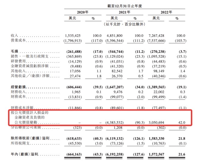 這兩項(xiàng)數(shù)據(jù)的差異就在于,極兔2021年和2022年分別計(jì)入了-43.8億美元、30億美元的公允價(jià)值變動(dòng),所以去年凈利潤看上去就變成盈利了。??????