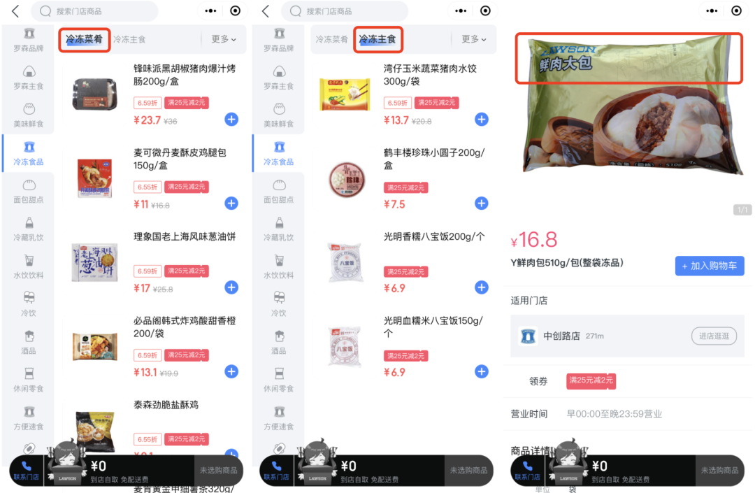 在“羅森點點”微信小程序上,冷凍食品共計38個SKU,包含冷凍菜肴、冷凍主食兩個子分類,具體有鋒味派黑胡椒豬肉爆汁烤腸、泰森勁脆鹽酥雞、理象國老上海風味蔥油餅、圣農(nóng)香辣雞塊、灣仔玉米蔬菜豬肉水餃、鶴豐樓珍珠小圓子等產(chǎn)品,還包括羅森自有商品香菇蔬菜包、鮮肉大包等。
