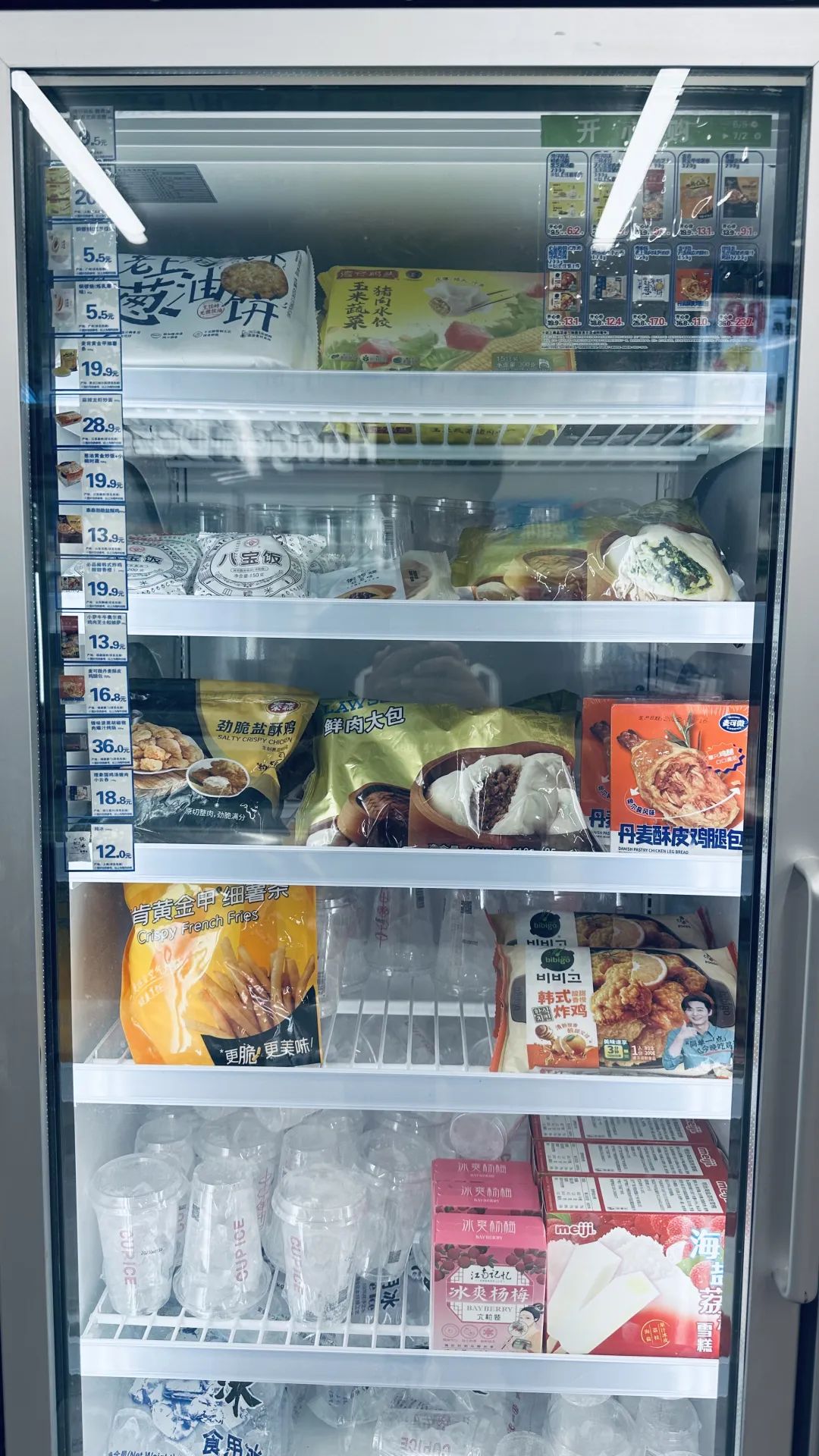 筆者在上海羅森便利店中創(chuàng)路店看到,進店左手邊一組雙開門的6層冷凍柜中陳列著等預制菜產(chǎn)品,預制菜立式凍柜與鮮食風幕柜相鄰,形成冷凍+冷藏多溫層商品組合。
