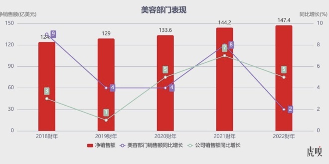 這五大業(yè)務(wù)板塊中,織物及家居護理規(guī)模最大,2022財年,其營收占比為35%;美容業(yè)務(wù)是寶潔的第三大業(yè)務(wù),2022財年凈銷售額接近150億美元,約占寶潔總營收的五分之一。