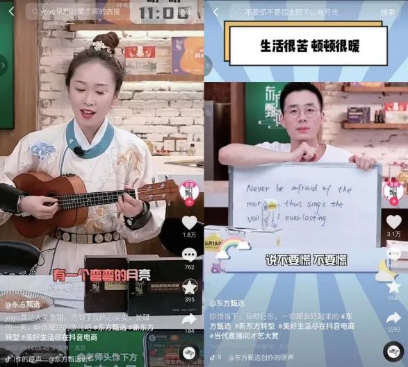 相比于其他抖音帶貨直播間,東方甄選的直播間顯得較為“慢節(jié)奏”。在直播帶貨的過程中,主播既不強(qiáng)調(diào)產(chǎn)品的價(jià)格,也不過分宣傳產(chǎn)品的品質(zhì),而是將產(chǎn)品故事娓娓道來(lái)的同時(shí),賦予產(chǎn)品所蘊(yùn)含的文化與生活意義。文化知識(shí)分享、人生感悟、英語(yǔ)教學(xué)、歌曲才藝等都是東方甄選直播間的常態(tài)內(nèi)容。