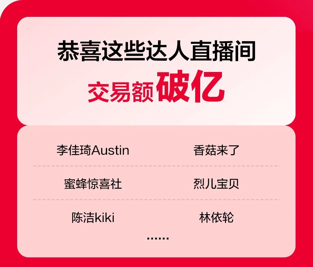 去年雙11預(yù)售,淘寶官方只是披露了銷售額破千萬(wàn)的直播間數(shù)量,而618預(yù)售剛結(jié)束,淘寶直播就迫不及待地公布了一份成績(jī)單:直播預(yù)售首日,李佳琦Austin、香菇來(lái)了、蜜蜂驚喜社等直播間交易額成功破億。