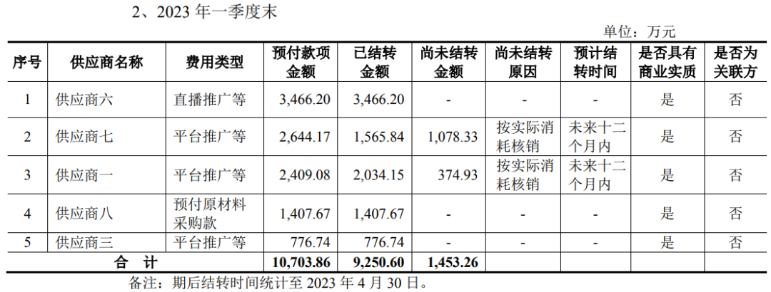 “2023年一季度末預付賬款余額大幅增長的主要原因系公司為應對第二季度公司系列大促活動而提前支付的各項平臺推廣充值款、直播達人預訂坑位等市場推廣服務預付款項,根據實際消耗進行結算,具有合理性!必愄┠菰诠嬷袑Υ嘶貜头Q。