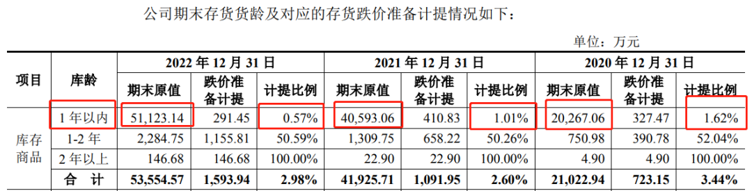 公告顯示,2020年—2022年各期末,對于1年以內的庫存商品,貝泰妮采取的跌價準備計提比例分別為1.62%、1.01%、0.57%,對應的庫存商品期末金額分別為2.03億元、4.06億元、5.11億元?梢,隨著庫存商品規(guī)模越大,貝泰妮的跌價準備計提比例縮小。