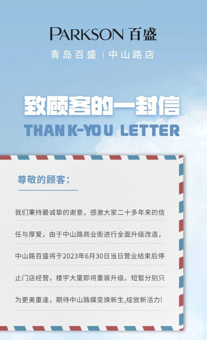 6月16日晚,青島百盛中山路店官方微信發(fā)布《致顧客的一封信》,宣布由于中山路商業(yè)街進(jìn)行全面升級改造,中山路百盛將于2023年6月30日當(dāng)日營業(yè)結(jié)束后停止門店經(jīng)營,樓宇大廈即將重裝升級。