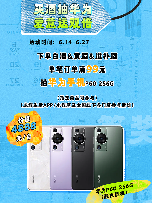 自6月14日起至6月27日,下單白酒&黃酒&滋補(bǔ)酒單筆訂單滿99元即有機(jī)會參與抽取華為手機(jī)P60 256G(指定商品可參與,永輝生活A(yù)PP/小程序及全國線下各門店參與活動)。