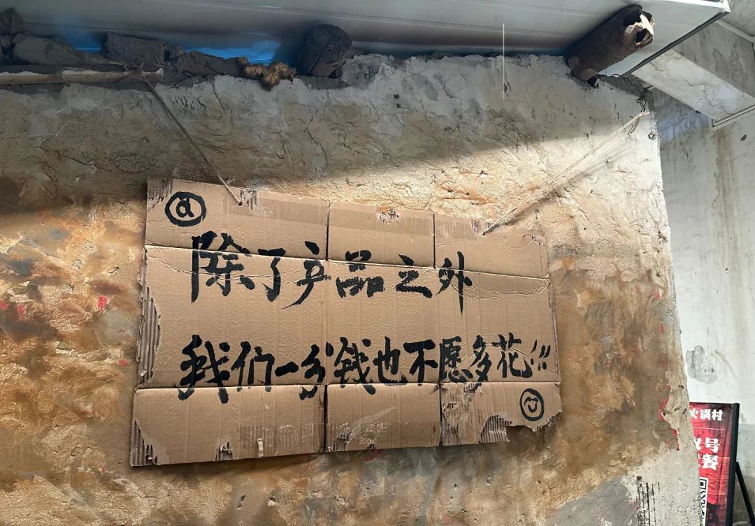再比如北步園火鍋村,在門口直接放上蒸籠,感覺像是去吃農(nóng)村大席,更有意思的是它直接在紙牌上寫著“今日現(xiàn)推豆花有售”、“今日現(xiàn)蒸包子有售”、“除了產(chǎn)品之外,我們1分錢也不愿多花”,簡單粗暴的呈現(xiàn),非常有代入感。