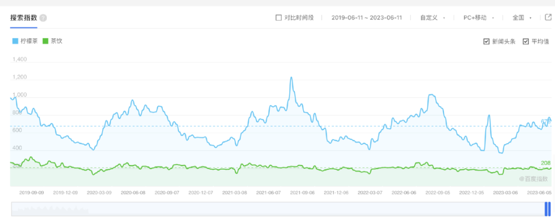 據(jù)百度指數(shù)顯示,過(guò)往4年(2019年6月11日—2023年6月11日),檸檬茶的熱度明顯高于茶飲,熱度高峰期多出現(xiàn)在6、7、8這三個(gè)月。