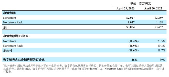2023年一季度與2022年一季度諾德斯特龍各門店凈銷售額數(shù)據(jù)對比。來源:Nordstrom