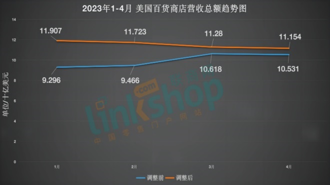 據(jù)美國人口普查局公布數(shù)據(jù)顯示,美國百貨公司調(diào)整后銷售額從今年一月的119.07億美元降至三月的112.8億美元,再到四月降至111.54億美元,銷售額出現(xiàn)連續(xù)下滑。服飾銷售也受到同樣影響,四月的美國服裝店銷售額同三月相比也出現(xiàn)了下滑。要知道,服飾銷售可是百貨公司盈利的重要組成部分。