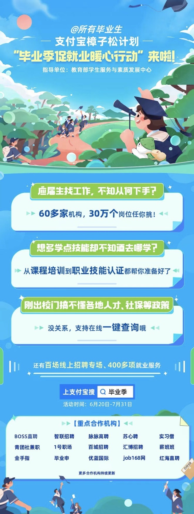 畢業(yè)季來臨,為助力青年人群就業(yè),支付寶平臺聯(lián)動多個合作伙伴,共同發(fā)起“樟子松計劃”。
