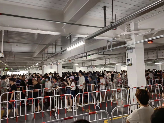 據(jù)媒體報道,截至6月20日9:00,首日預(yù)約人數(shù)已超過1.6萬人,9:00左右大量消費(fèi)者排隊(duì)進(jìn)場,排隊(duì)時長1個小時至1.5個小時。工作人員會在現(xiàn)場一一檢查顧客的預(yù)約碼,核實(shí)身份后才允許進(jìn)入門店內(nèi)。開業(yè)前5日均采取限流方式,通過在線預(yù)約,將人流量控制在2萬上限。