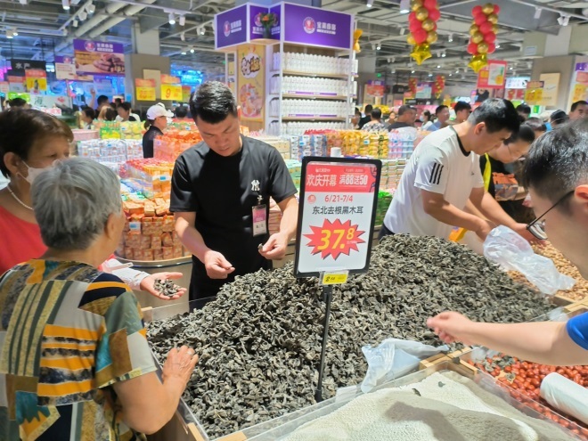 開業(yè)第一天,店內上新大潤發(fā)的特色商品RT100近100款好物,包括香烤雞翅包飯、臺灣風味腸、棗泥核桃糕、瑞士卷、呷無忌小青檸、薈尚大米等。還有自有品牌呷無忌、薈尚、潤發(fā)優(yōu)質系列好物也在賣場進行了集中陳列,方便顧客選購,同時帶來大潤發(fā)新鮮出爐的鮮花品牌“大潤花”。
