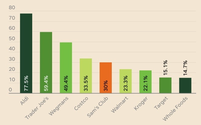 美國各超市自有品牌銷售占比。圖源:Numerator