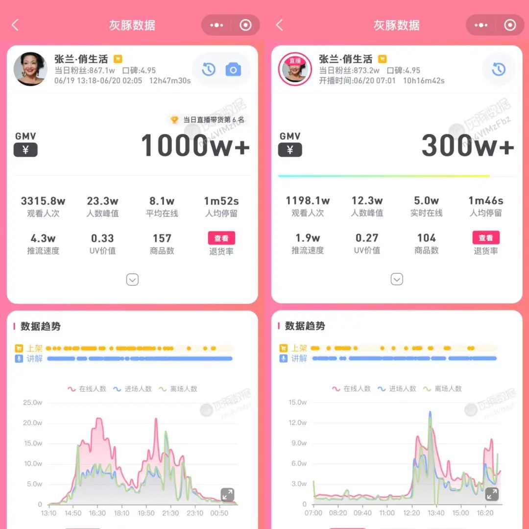 據(jù)灰豚數(shù)據(jù)顯示,6月19日張?zhí)m在抖音開(kāi)播,不到6小時(shí),便吸引1700萬(wàn)觀看人次,全天共吸引觀看人次3300萬(wàn),GMV達(dá)1000萬(wàn)。