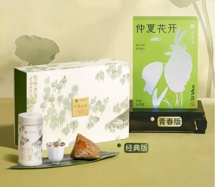 此路不通,不如另辟他徑。今年,奈雪的茶決定從國潮入手,和朵云軒跨界尋找靈感。其新推的“非遺仲夏花開山水端午”禮盒,以齊白石的畫為視覺靈感,并配以白茶,試圖把粽子打造成中式茶點。