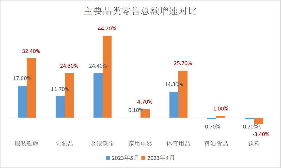 具體來看,從4月到5月,在商品零售的各個(gè)品類中,金銀珠寶和服裝鞋帽兩個(gè)品類的增速表現(xiàn)最佳,而在2022年表現(xiàn)上佳的糧油食品、飲料品類,增速表現(xiàn)遠(yuǎn)遠(yuǎn)低于商品零售總額大盤。