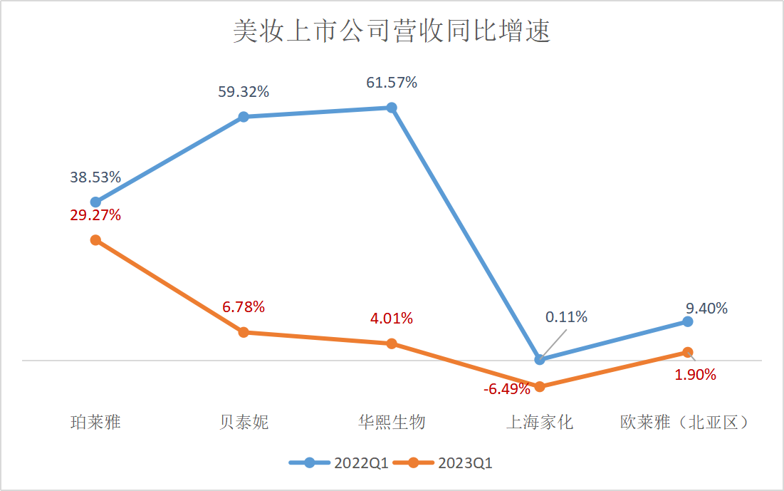 參考美妝類上市公司2023年Q1的表現(xiàn),珀萊雅、貝泰妮、華熙生物、上海家化,歐萊雅北亞區(qū)(含中國市場)的增速,均低于2022Q1。
