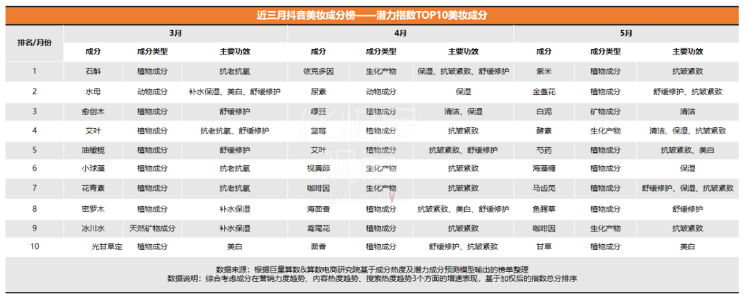 1、僅艾葉、咖啡因兩次上榜。與相對穩(wěn)定的熱門成分不同,潛力成分每月變化較快,比如3月上榜的石斛、水母、愈創(chuàng)木等成分,4月和5月均落榜。而3月排名第四的艾葉,在4月位列第五,咖啡因在4月和5月均躋身TOP10榜,彰顯出了一定潛力。