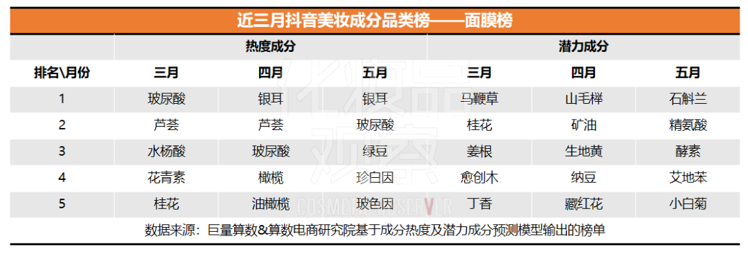 2、向功效進(jìn)階。除了基礎(chǔ)的補(bǔ)水保濕外,面膜產(chǎn)品中功效成分受關(guān)注。潛力成分榜中,3月以舒緩修護(hù)功效的“馬鞭草”為首,4月被抗皺緊致功效的成分霸榜,如納豆、藏紅花等,5月以抗皺緊致和保濕兩個(gè)功效霸榜,如主打抗氧化功效的艾地苯。