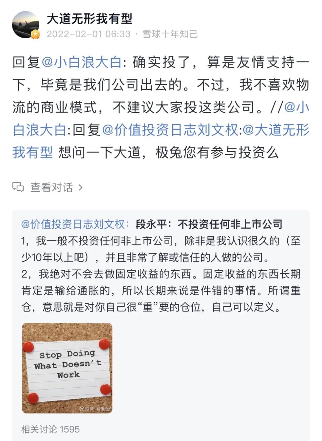 更為有趣的是,段永平本人也出手投了極兔。這源于2022年2月雪球APP上一段對話——一位網(wǎng)友問“大道無形我有型”是否參與投資極兔,很快便收到回復(fù):