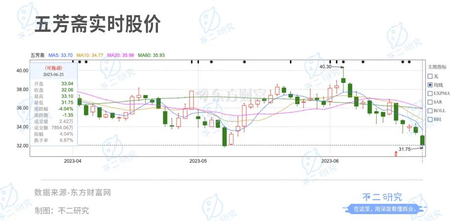 財(cái)報(bào)公布后的首個(gè)交易日(5月4日),其股價(jià)下跌7.78%。截至6月21日A股收盤,五芳齋報(bào)收32.06元/股,對(duì)應(yīng)市值46.12億元;對(duì)比去年9月市值高點(diǎn)60.24億元,五芳齋市值已蒸發(fā)近20億元。