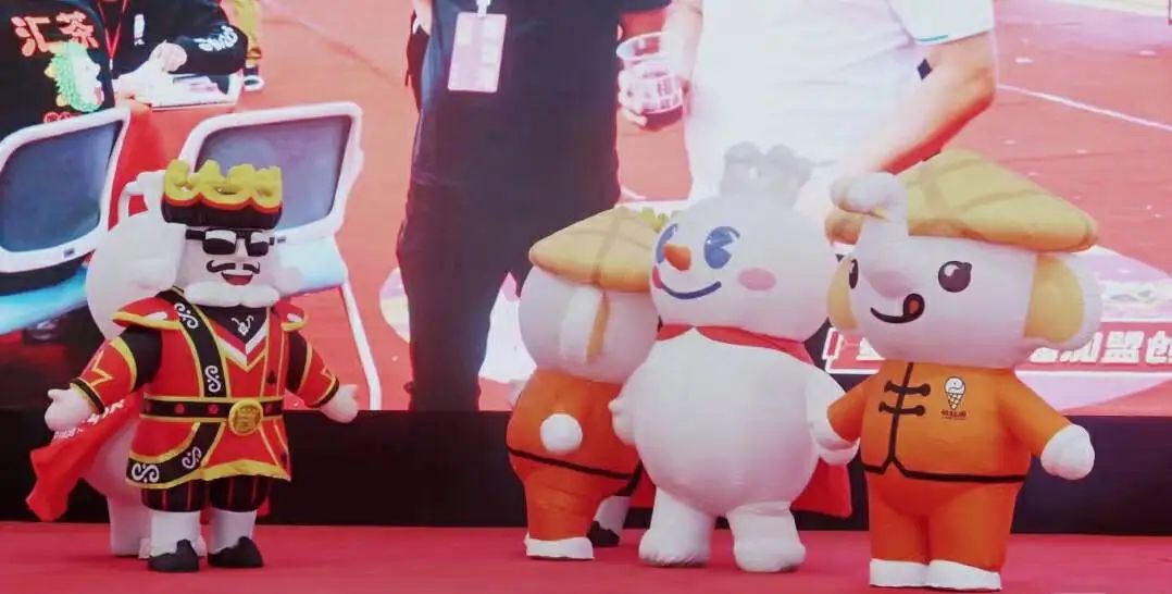 ◎蜜雪加盟大舞臺(tái)上的幸運(yùn)咖、蜜雪冰城與極拉圖(穿橙色衣服的小象)