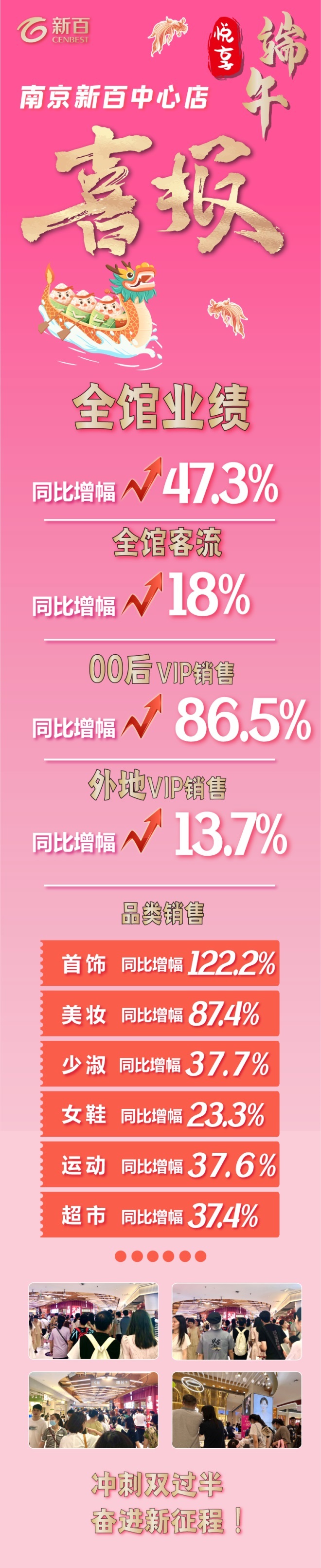 奮斗不止,精進(jìn)不怠。通過(guò)“618”和端午檔期的連續(xù)爆發(fā),南京新百中心店截至目前,實(shí)現(xiàn)全月業(yè)績(jī)穩(wěn)步上揚(yáng),并“優(yōu)于同行”,極大地增強(qiáng)了經(jīng)營(yíng)信心。后續(xù),新百全體干部員工將勠力同心,一鼓作氣,沖刺雙過(guò)半,奮進(jìn)新征程!