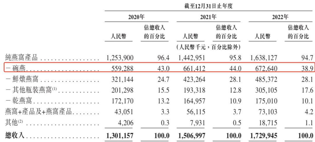拿2022年來看,燕之屋的純燕窩產(chǎn)品營收為16.381億元,占比94.7%,其中碗燕產(chǎn)品的營收為6.726億元,占比38.9%;鮮燉燕窩的營收為4.854億元,占比28.1%;其他瓶裝燕窩產(chǎn)品的營收為3.051億元,占比17.6%;干燕窩的營收為1.75億元,占比10.1%。