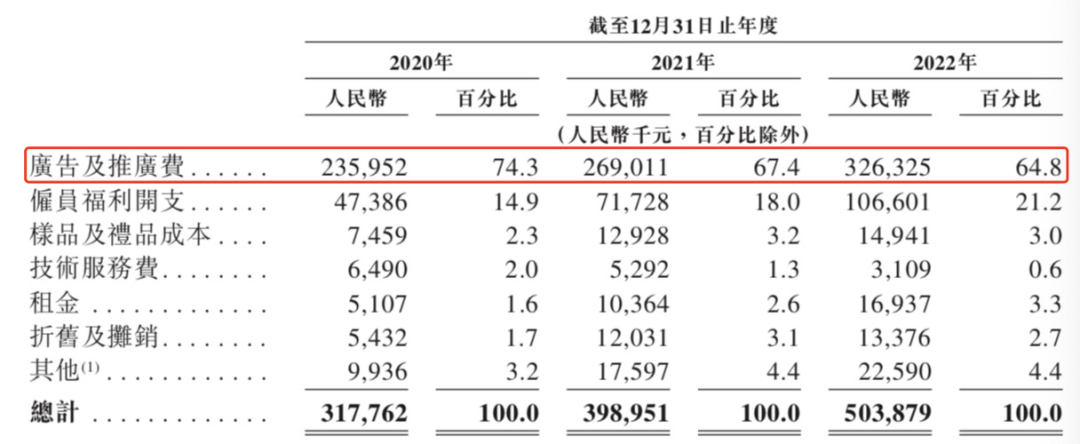 招股書顯示,燕之屋于2020年、2021年及2022年的銷售及經(jīng)銷開支分別為3.18億元、3.99億元及5.04億元,分別占當年營業(yè)收入的24.4%、26.5%及29.1%,年年攀升。其中,廣告及推廣費用構(gòu)成銷售及經(jīng)銷開支的最大組成部分,分別占2020年、2021年及2022年銷售及經(jīng)銷開支總額的74.3%、67.4%及64.8%。