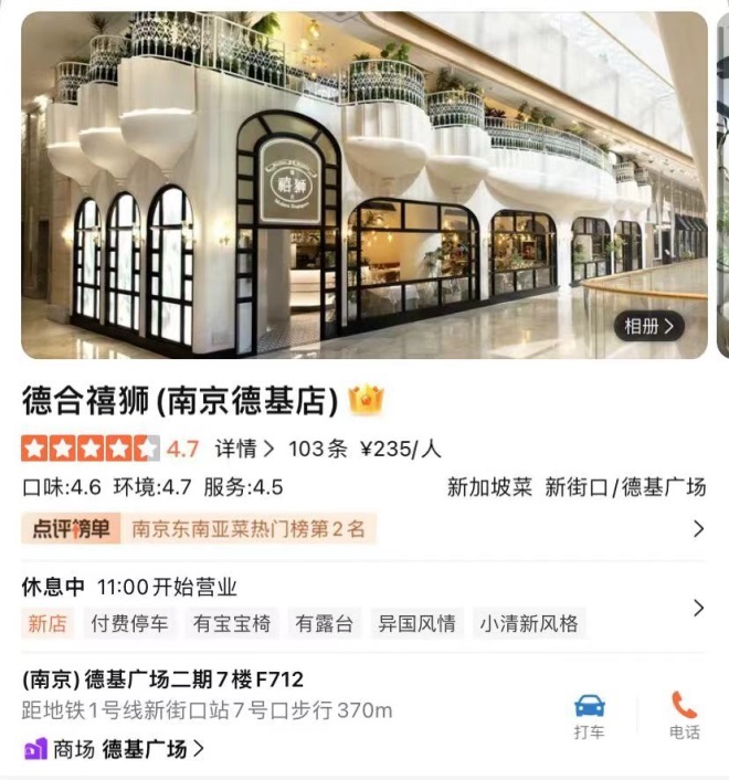 6月11日,新加坡料理禧獅全國首店在南京德基廣場正式開業(yè)。