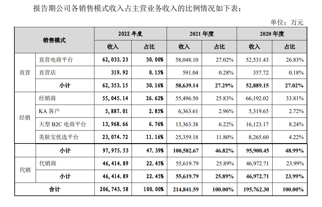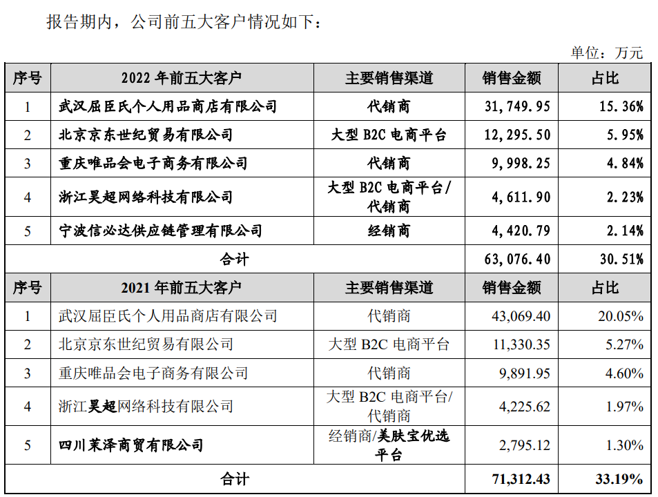 招股書顯示,2022年,經(jīng)銷商+KA客戶+代銷商的總收入為10.69億元,占比51.92%。其中屈臣氏連續(xù)三年是第一大客戶,貢獻(xiàn)值均超過15%,2022年為3.2億元,是第二大客戶京東的一倍有余。
