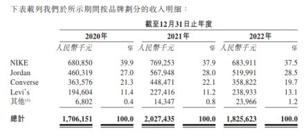 此外,于2020年、2021年及2022年,品牌合作伙伴提供的耐克旗下品牌NIKE、Jordan及Converse產品合共分別占永興東潤總采購的36.2%、28.6%及24.0%。