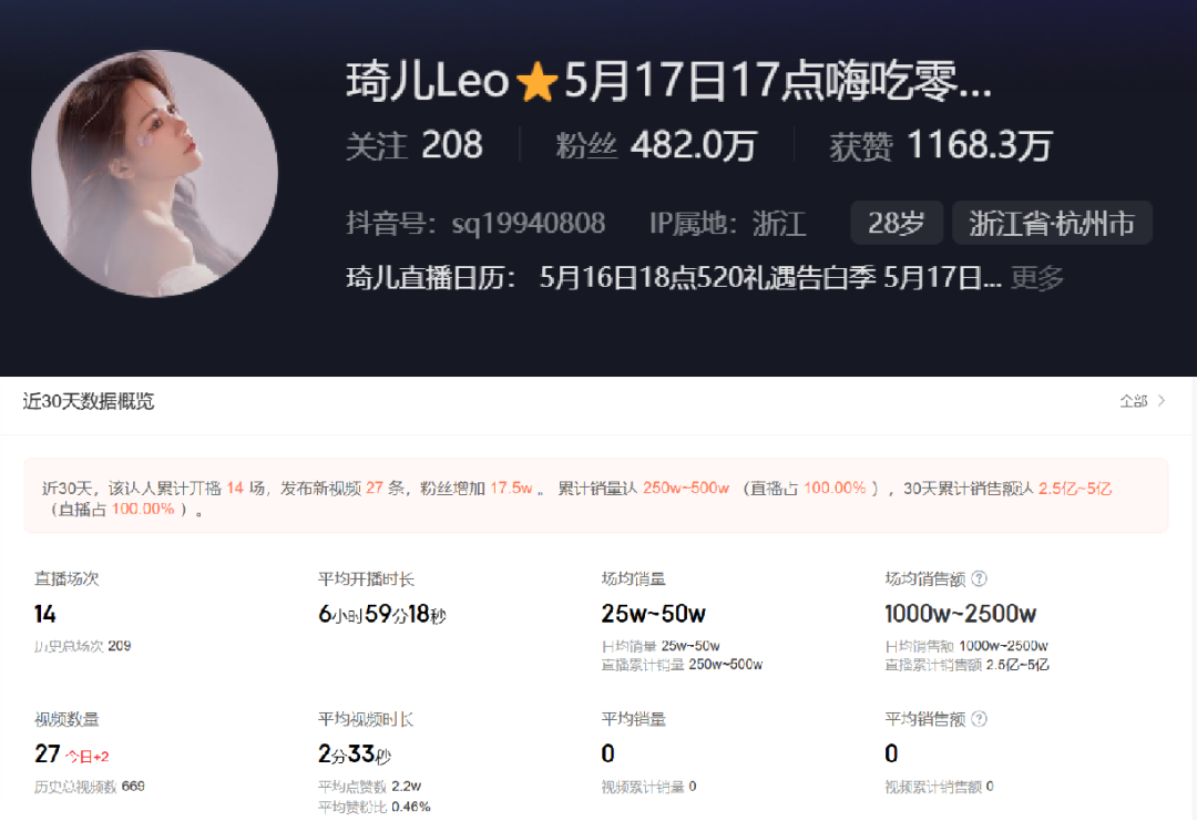 琦兒Leo抖音主頁及最近帶貨數(shù)據(jù),圖/抖音APP、蟬媽媽數(shù)據(jù)
