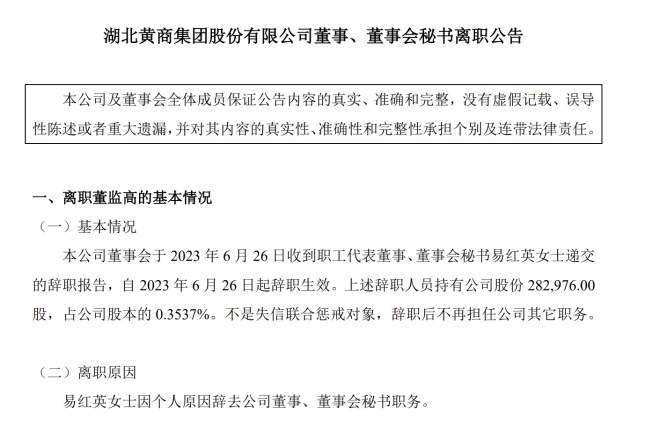 聯(lián)商快訊:6月27日,黃商股份發(fā)布高管人事變動公告,易紅英因個人原因辭去公司董事、董事會秘書職務。