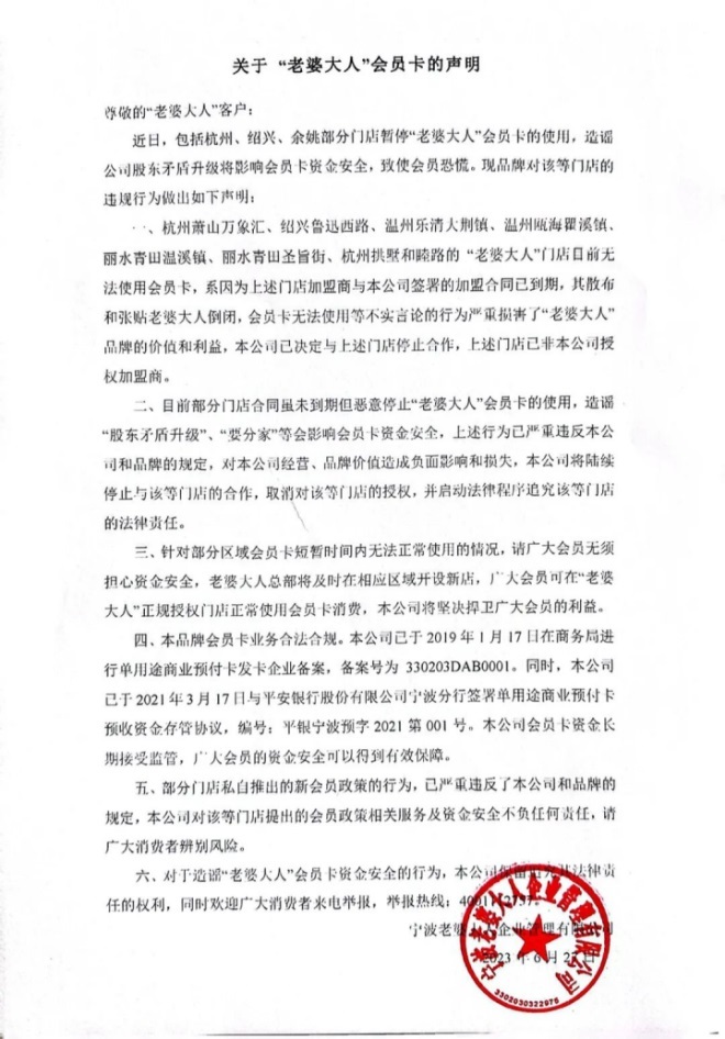 2023年以來,浙江多地陸續(xù)傳來老婆大人門店宣布會(huì)員卡停止使用的消息,倒閉傳言甚囂塵上,引發(fā)一眾消費(fèi)者恐慌。