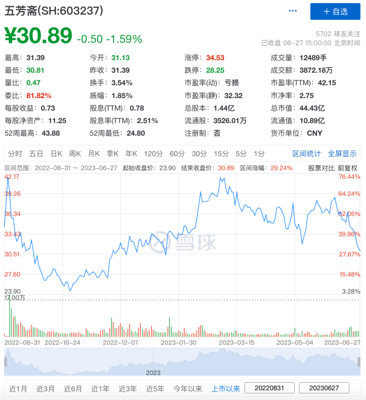自去年8月上市以來,五芳齋(603237.SH)的股價(jià)走勢(shì)可謂是過山車般的高開低走。