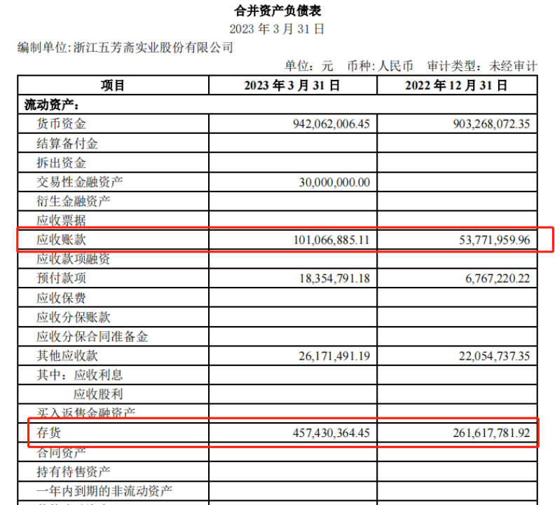 數(shù)據(jù)顯示,僅三個(gè)月時(shí)間,五芳齋的存貨規(guī)模從2022年底的2.62億元猛增至4.57億元,創(chuàng)下了歷年來Q1季度存貨成本的新高。