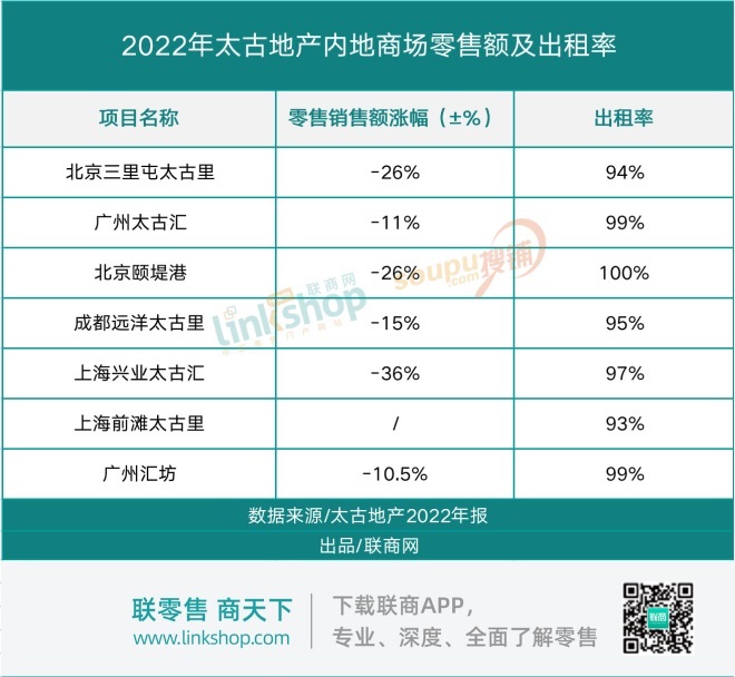 內(nèi)地物業(yè)租金收入上,扣除2022年太古地產(chǎn)中國內(nèi)地投資物業(yè)組合的租金收入總額(扣除租金支援1.13億港元)為33.24億港元,較2021年減少8%。其中內(nèi)地零售物業(yè)租金收入總額(扣除租金支援1.13億港元)下跌9%至29.43億港元。撇除租金支援及人民幣價值變動影響,租金收入總額下跌2%。