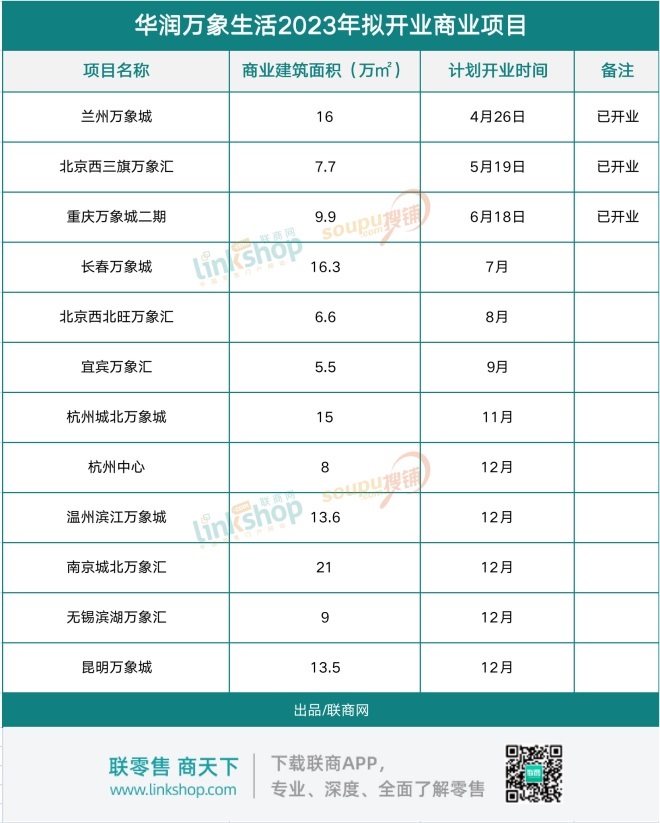 據(jù)聯(lián)商網(wǎng)零售研究中心統(tǒng)計,2023年的供應情況上,華潤萬象生活將投運12個商業(yè)項目,包括了蘭州萬象城、北京西三旗萬象匯、重慶萬象城二期、長春萬象城、北京西北旺萬象匯、宜賓萬象匯、杭州城北商業(yè)項目、杭州中心、溫州鹿城老港區(qū)商業(yè)項目、南京燕子磯商業(yè)項目、昆明萬象城、無錫濱湖萬象匯。
