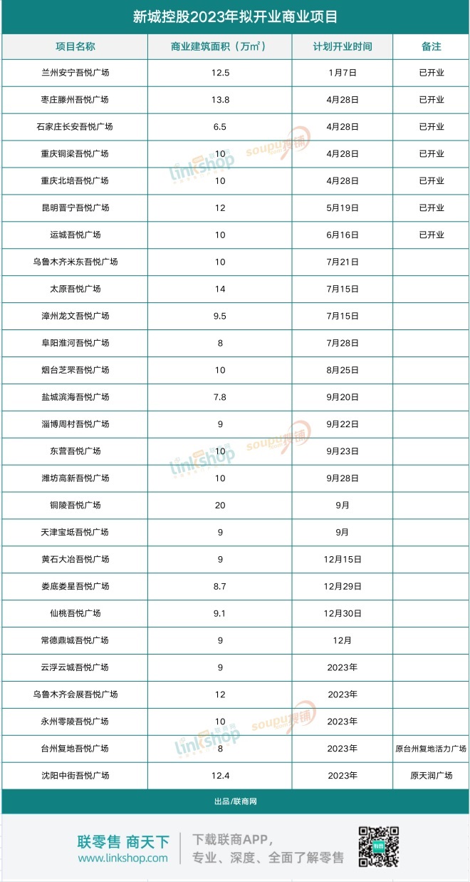 聯(lián)商網(wǎng)此前統(tǒng)計的數(shù)據(jù),2023年新城控股預計在全國新開20座商業(yè)項目,計劃2023年實現(xiàn)商業(yè)運營總收入110億元。