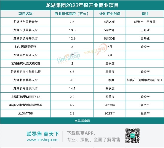 2023年,龍湖商業(yè)在全國預計將開業(yè)12座商業(yè)體,包括長沙芙蓉天街、寧波海曙天街、濟南北宸天街等全自持商業(yè),也有石家莊裕華星悅薈、北京北苑天街、上海江灣里MEET678等輕資產(chǎn)。