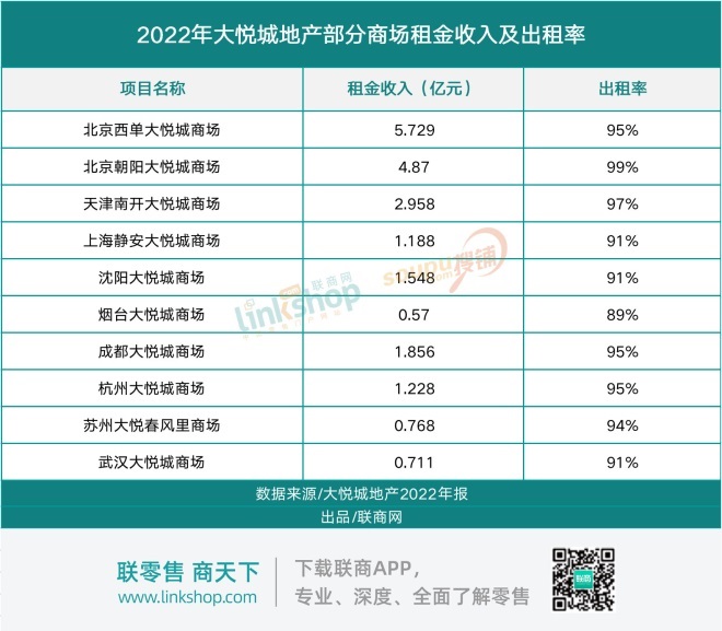 截至到2022年年底,大悅城地產(chǎn)在營項目29個(含輕資產(chǎn)和非標準化產(chǎn)品),總商業(yè)面積 304 萬平米;其中包括18個大悅城購物中心(含輕資產(chǎn)),總商業(yè)面積265萬平米。在建、籌備的項目(含輕資產(chǎn))17 個,商業(yè)面積約172萬平米。
